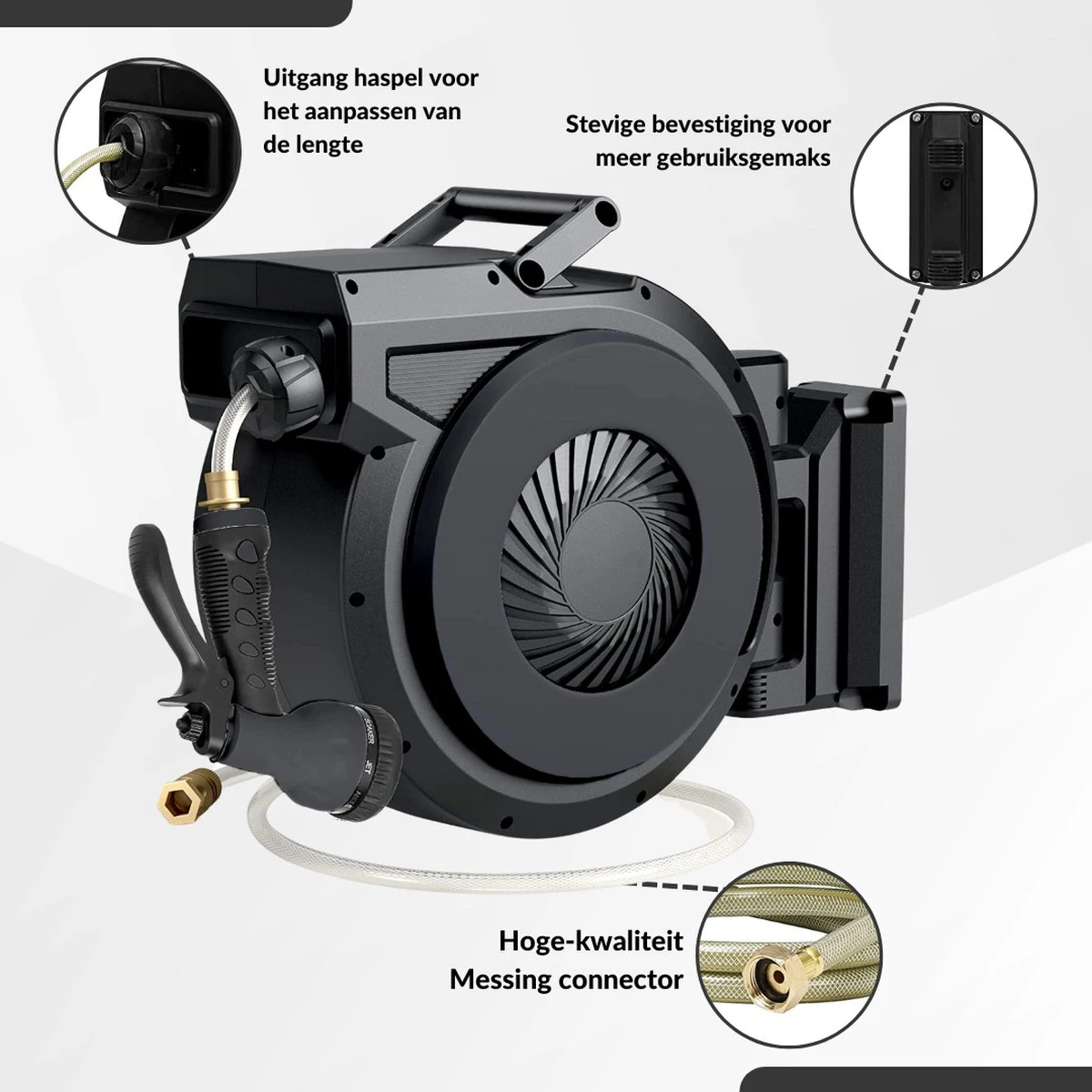 Ben je dol op tuinieren maar ben je het beu om met de waterslang te knoeien? De Buxibo Wandslangenbox verlost je van al dat geknoe. De tuinslang met haspel is dankzijn het zelfoprollende systeem een uitstekende oplossing voor iedereen die bezig is in de tuin. Met slechts een lichte ruk kan de slang oprollen in een de box. De wandslangenbox van Buxibo is 180 graden flexibel en draai alle kanten met je mee. Met een bereik van maar liefst 22 meter heb je zo alle plantjes voorzien van voldoende water. De spoeisysteem heeft 9 sproeistanden en bovendien krijg je nu ook een gratis sproeier erbij met 4 sproeistanden.
