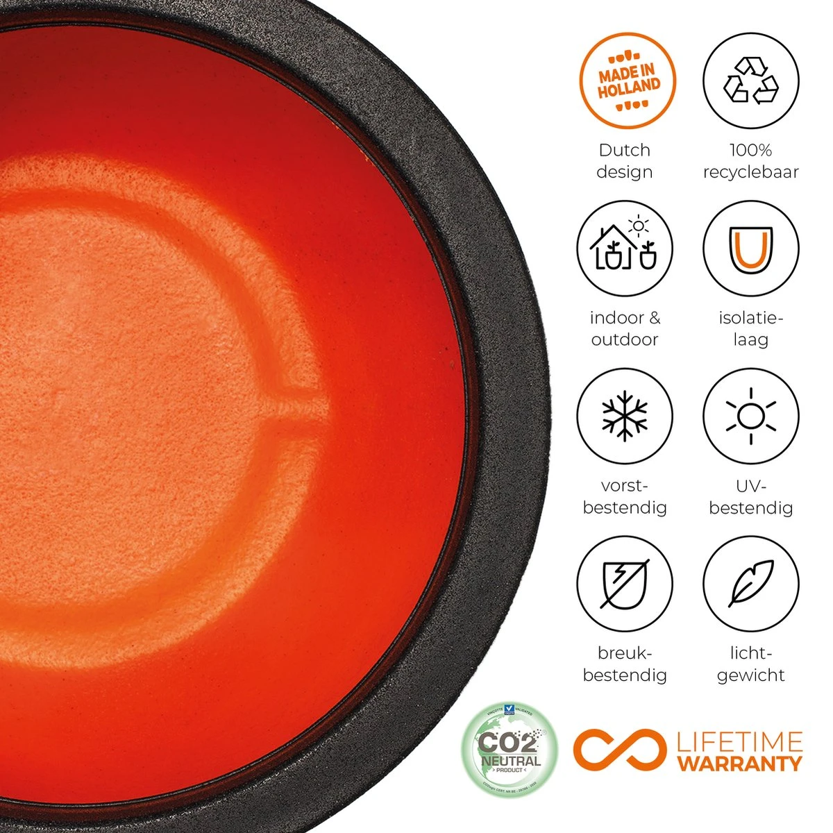 Deze duurzame bloempot uit de Capi Nature Rib NL collectie is CO2 neutraal geproduceerd en gemaakt met gerecyclede materialen. De oranje binnenkant van de pot is een knipoog naar de Nederlandse productie en tevens een isolatielaag die de potten beschermt tegen vorst in de winter en hitte in de zomer. Deze extra laag zorgt ook voor meer stevigheid, waardoor deze pot breukbestendig is. De pot is geschikt voor indoor en outdoor gebruik en beschikt over een levenslange garantie.