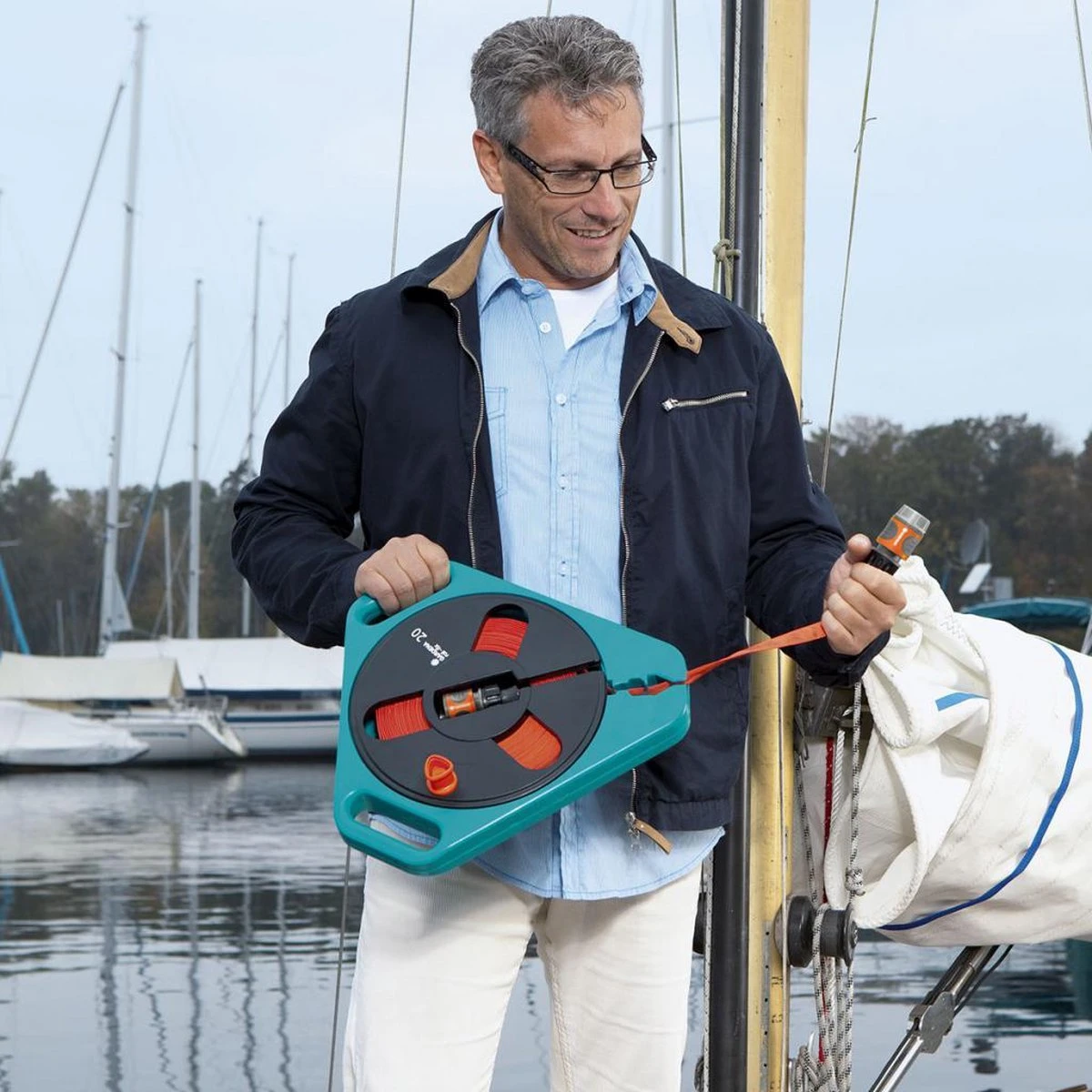 Gardena roll-fix, 20 m platte slang in cassette Licht en compact. Geïmpregneerde platte slang. Met veiligheids automaat die voorkomt dat bij het onopzettelijk onder druk zetten van de nog niet afgerolde slang, de draagcassette stuk gaat. Barstdruk boven 25 bar. Compleet met Original Gardena System aansluitstukken en tuinspuit. roll-fix 20 – 20 m.