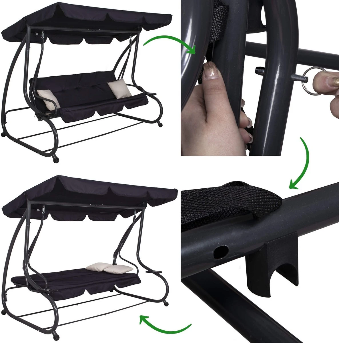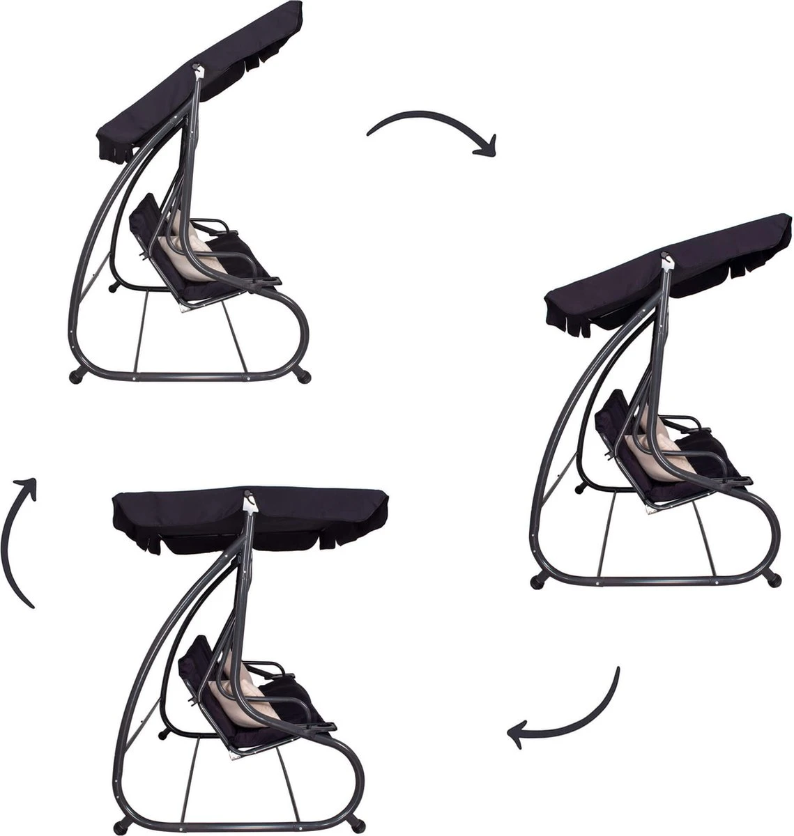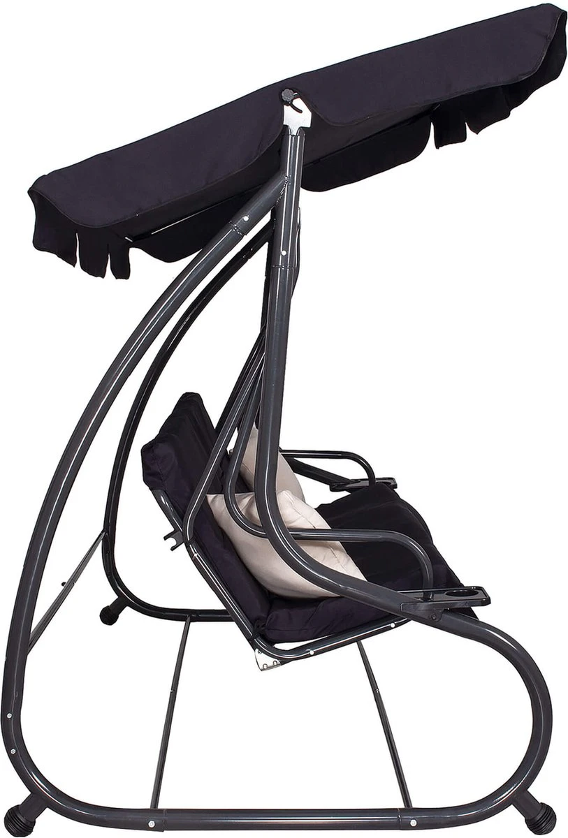 De luifel van de schommelbank is net als de rest van het materiaal waterdicht zodat je beschermt bent tegen de regen. Bovendien is de luifel af te stellen, zodat het ook tegen de zon bescherming biedt. Het stalen frame is bedekt met een coating die roesten tegengaat, zodat je jarenlang kunt genieten van de schommelbank. Verder zorgen details als antislippoten, stevige veren en een mooi design ervoor dat niks in de weg staat om optimaal te genieten!