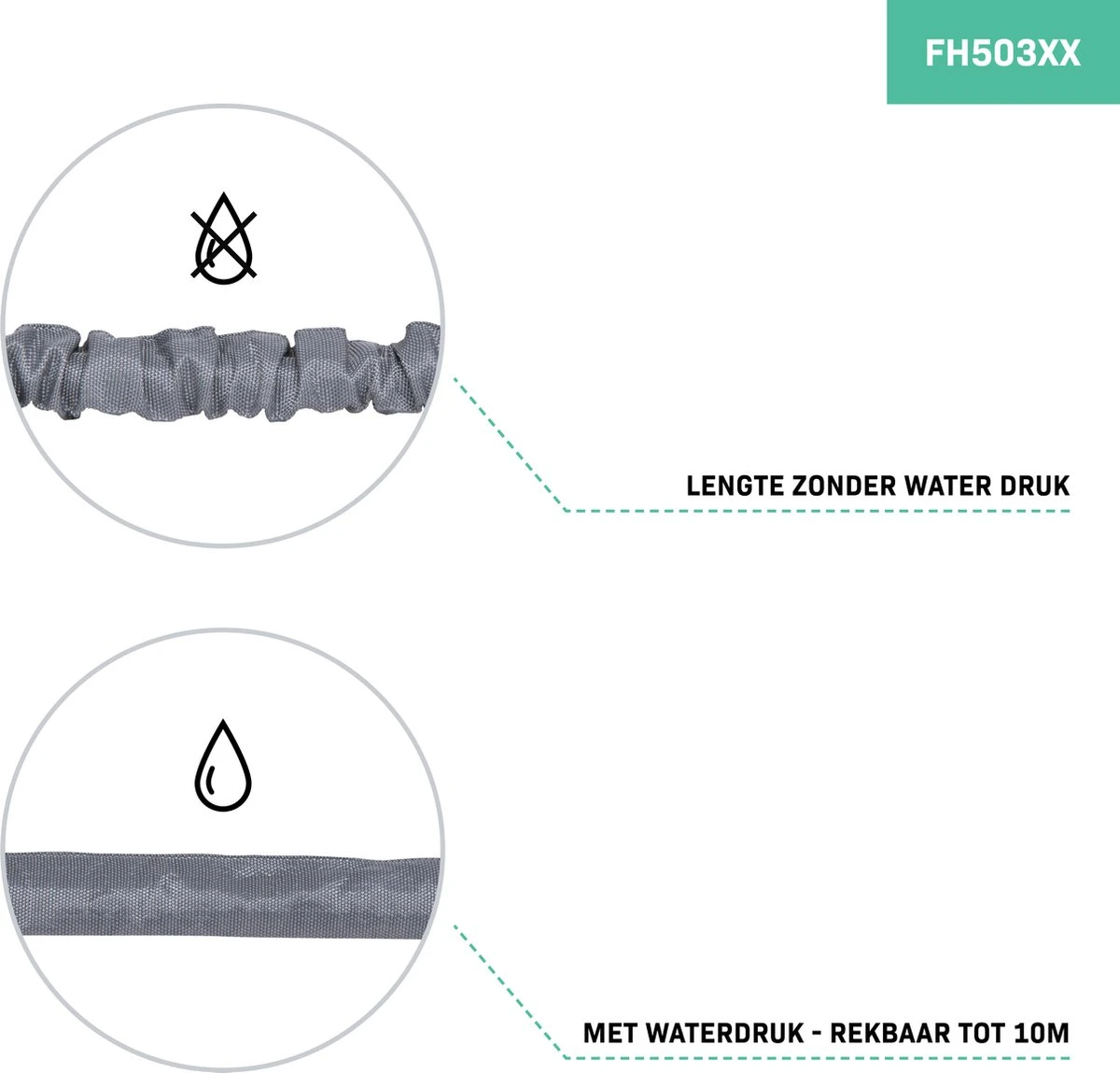 - De flexibele tuinslang heeft een minimale lengte van 3,7 meter, maar is tot drie keer uittrekbaar waardoor je een lengte van wel 10 meter behaald.